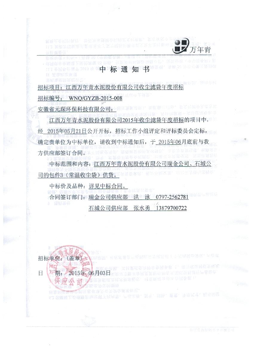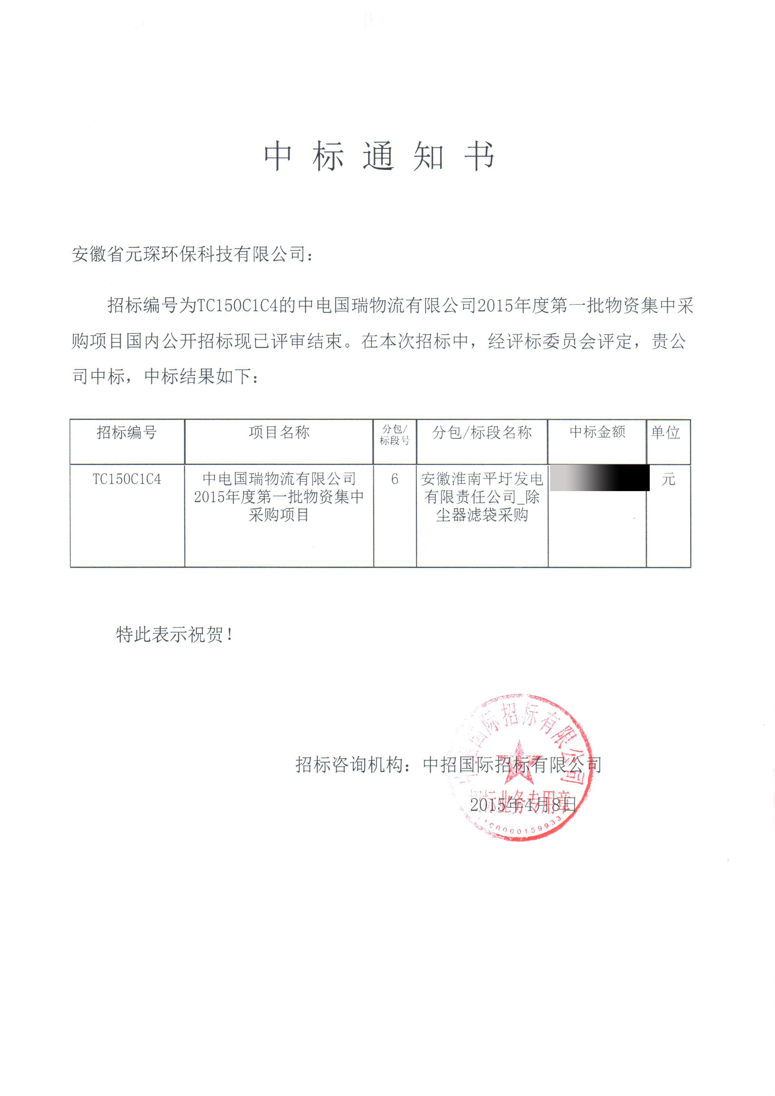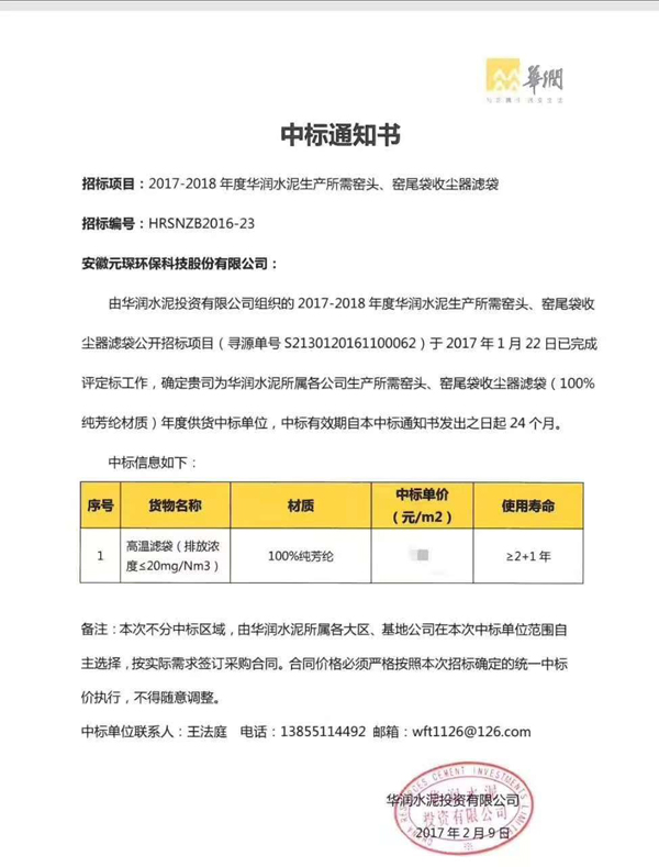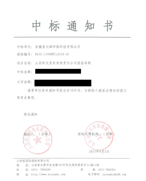 我司成为山西阳光发电有限责任公司滤袋采购项目中标单位